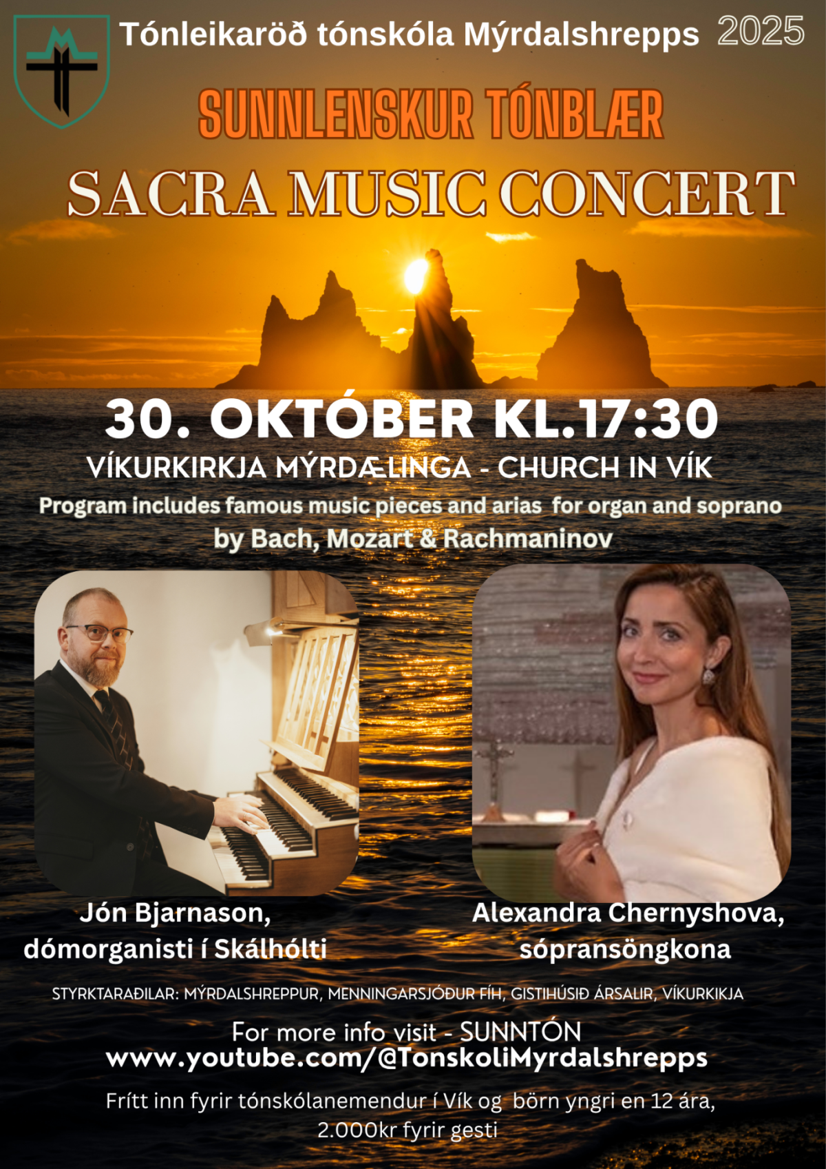 Tónleikaröð Sunnlenskur Tónblær er styrkt af Mýrdalshrepp, Menningarsjóði FÍH, Gistihúsinu Ársalir og Víkurkrikju.