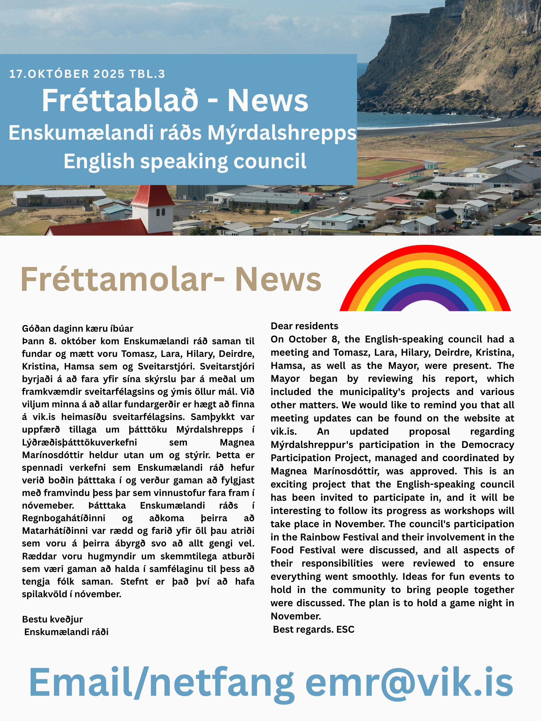 Enskumælandi ráð Mýrdalshrepps var stofnað haustið 2022 í von um að geta aukið áhrif nýbúa í samfélaginu og fjölga tækifærum þeirra til að taka þátt í nefndarstörfum og stefnumótun sveitarfélagsins. Meðlimir ráðsins voru skipaðir af sveitarstjórn og var horft sérstaklega til þess að meðlimir hefðu sem fjölbreyttastan bakgrunn til að endurspegla mannflóruna í sveitarfélaginu.