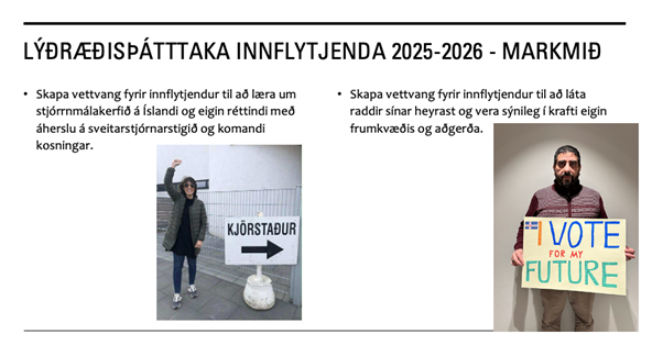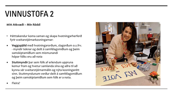 Vissir þú það? Hefur þú áhuga á að fá fræðslu um réttindi þín, hlutverk sveitarstjórna, sveitarstjórnarkosningarnar og hvernig þú getur haft áhrif og tekið þátt í lýðræðinu? Hefur þú áhuga á að hitta aðra innflytjendur til að ræða málin og deila eigin reynslu?